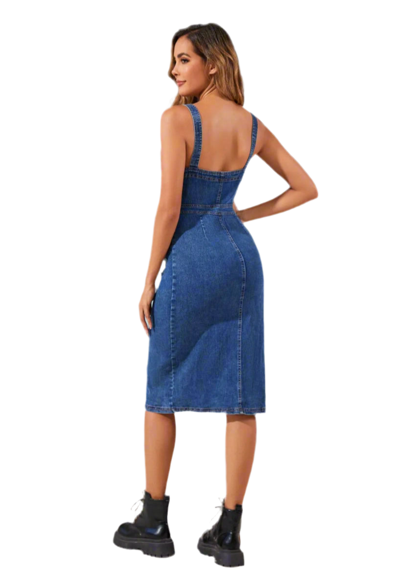Button Front Fitted Denim Midi Dress