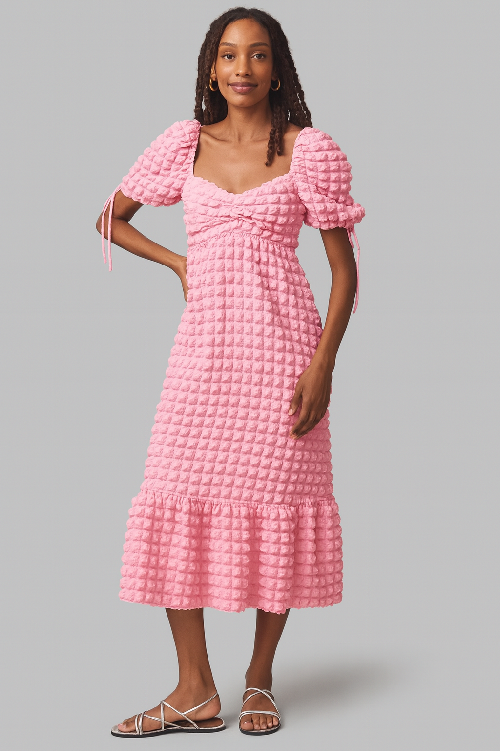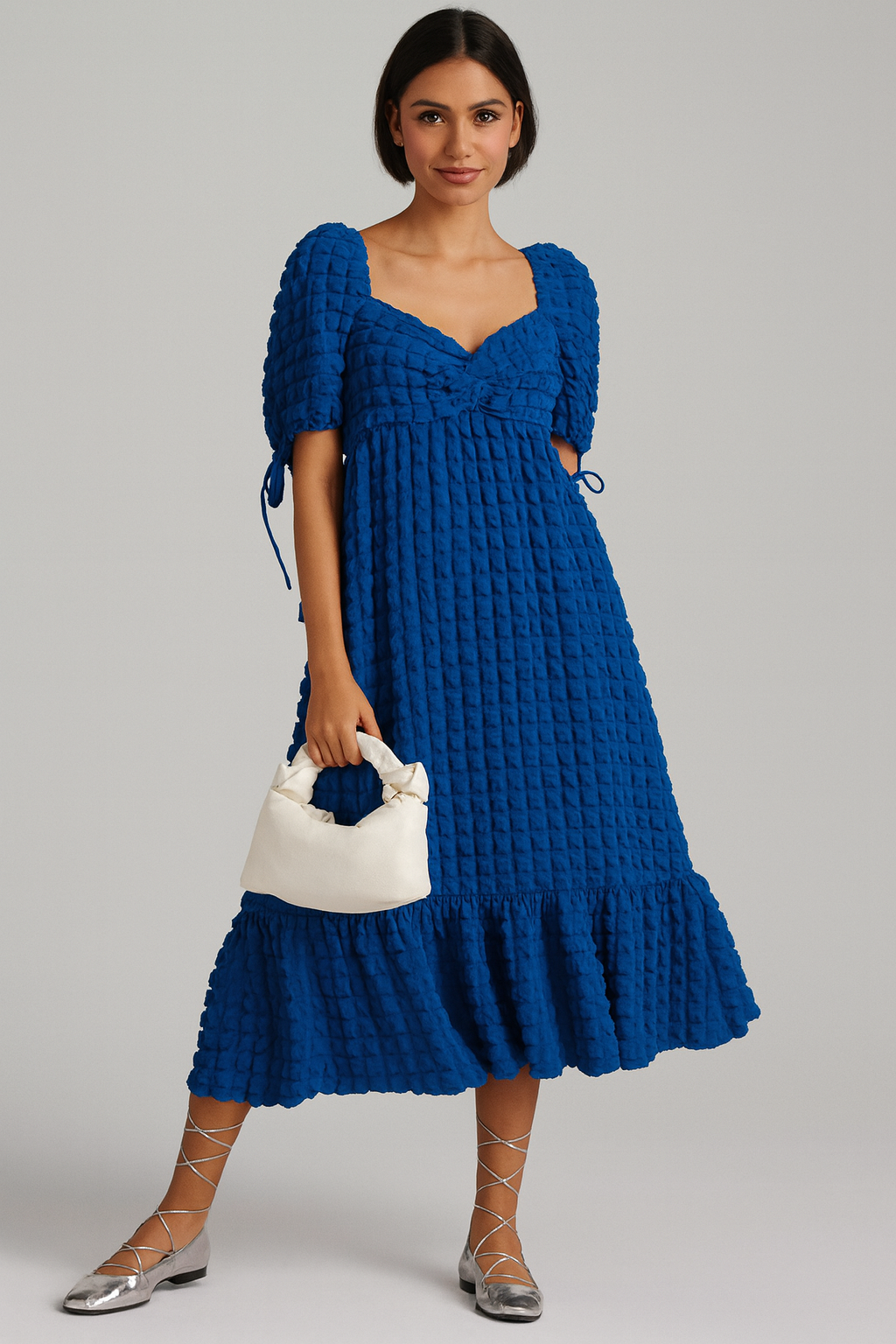 This charming dress combines timeless elegance with practical comfort. The sweetheart neckline and short sleeves create a flattering silhouette, while delicate smocking adds refined texture and visual interest. Crafted from a breathable cotton-polyester blend (80% polyester, 20% cotton), the unlined construction offers lightweight wear perfect for transitional seasons. The fitted waist emphasises your shape without restrictive stretch. Machine wash cold and tumble dry low for easy care. Available in sizes S–XL with precise measurements provided for an ideal fit.